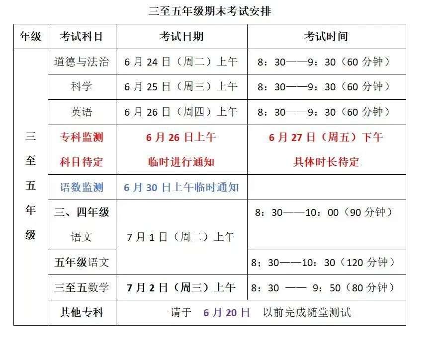 1. 小学三至六年级期末监测科目为:语文、数学、英语、道德与法治(五年级);